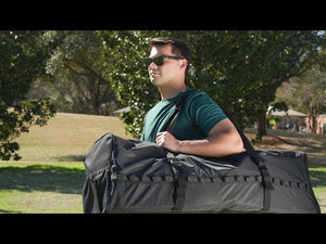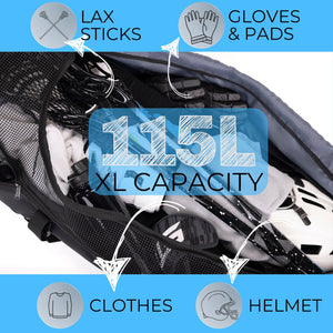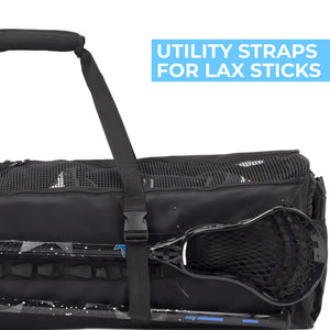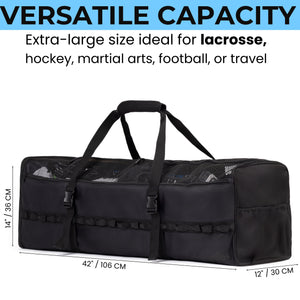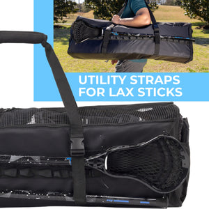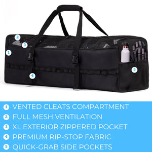 This oversized duffle bag holds everything you need on the field. This soft-sided duffle has a cleats pocket on one end and dual side pockets on the other. Extra large zippered pockets on the exterior, along with the utility daisy-chain on both sides offer additional capacity. Smaller zippered pockets provide a space for valuables and accessories.