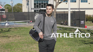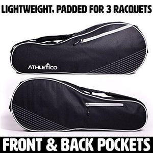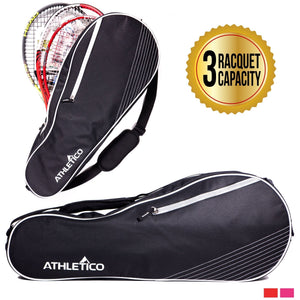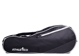 Athletico Competitor Tennis Racquet Bag features multiple XL compartments to allow you to organize your gear all in one place. The wide opening lets you easily fit up to three adult, standard or oversized rackets. Your rackets will be protected within the padded cover. The zippered front pocket is large enough to fit a can of tennis balls, a towel, etc. The soft, felt-lined back pocket can be used to store keys, wallet, cell phone, etc. Comfortable, lightweight design. Adjustable, padded shoulder strap allow the bag to be easily carried. Also features padded tote handle.