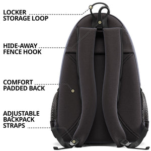 • Fence hook: perfect for keeping your backpack off the court; tucks away in hidden pocket when not in use