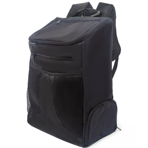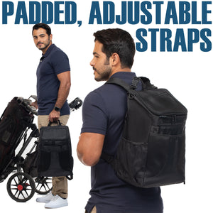 The Athletico Cooler Backpack attaches to any golf cart! Our original, exclusive design easily clips onto any golf push or pull cart for 18 holes of ICE COLD convenience. The clip on handle adjusts to fit over the upper golf bag bracket on push/pull carts and the hook and loop security strap fastens around the cart frame for extra stability. The padded backpack straps adjust for the perfect fit, and straps are secured so they never drag.