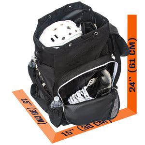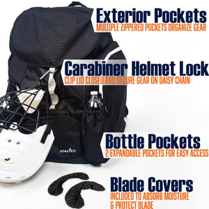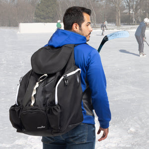 The Athletico Hockey Pond Backpack - original, exclusive design makes organizing and carrying your gear a breeze with isolated side skate zippered pockets, multiple exterior pockets, and large drawstring opening main compartment. This backpack allows you to carry the equipment you need and set your focus on your game.