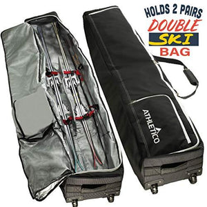 Padded, wheeled ATHLETICO DOUBLE-UP SKI BAG - fits 2 sets of skis + poles per bag. Sizes available: